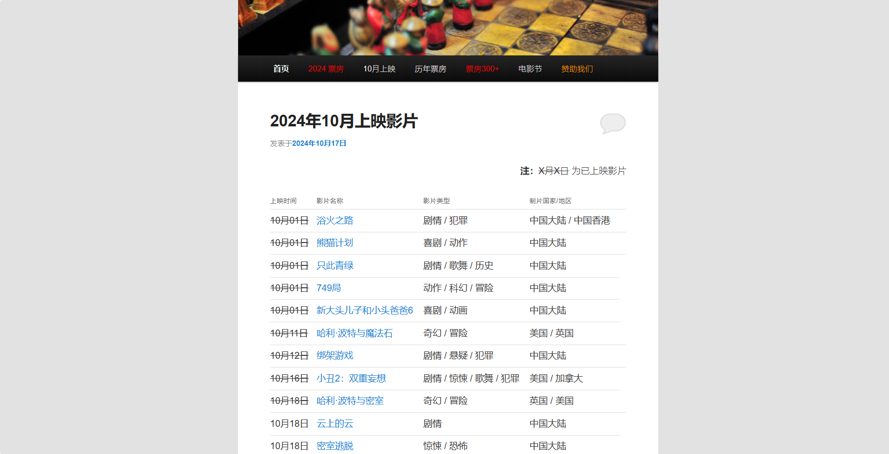 - 电影信息:展示即将上映和正在上映的电影的详细信息,包括上映时间、影片名称、类型和制片国家/地区。