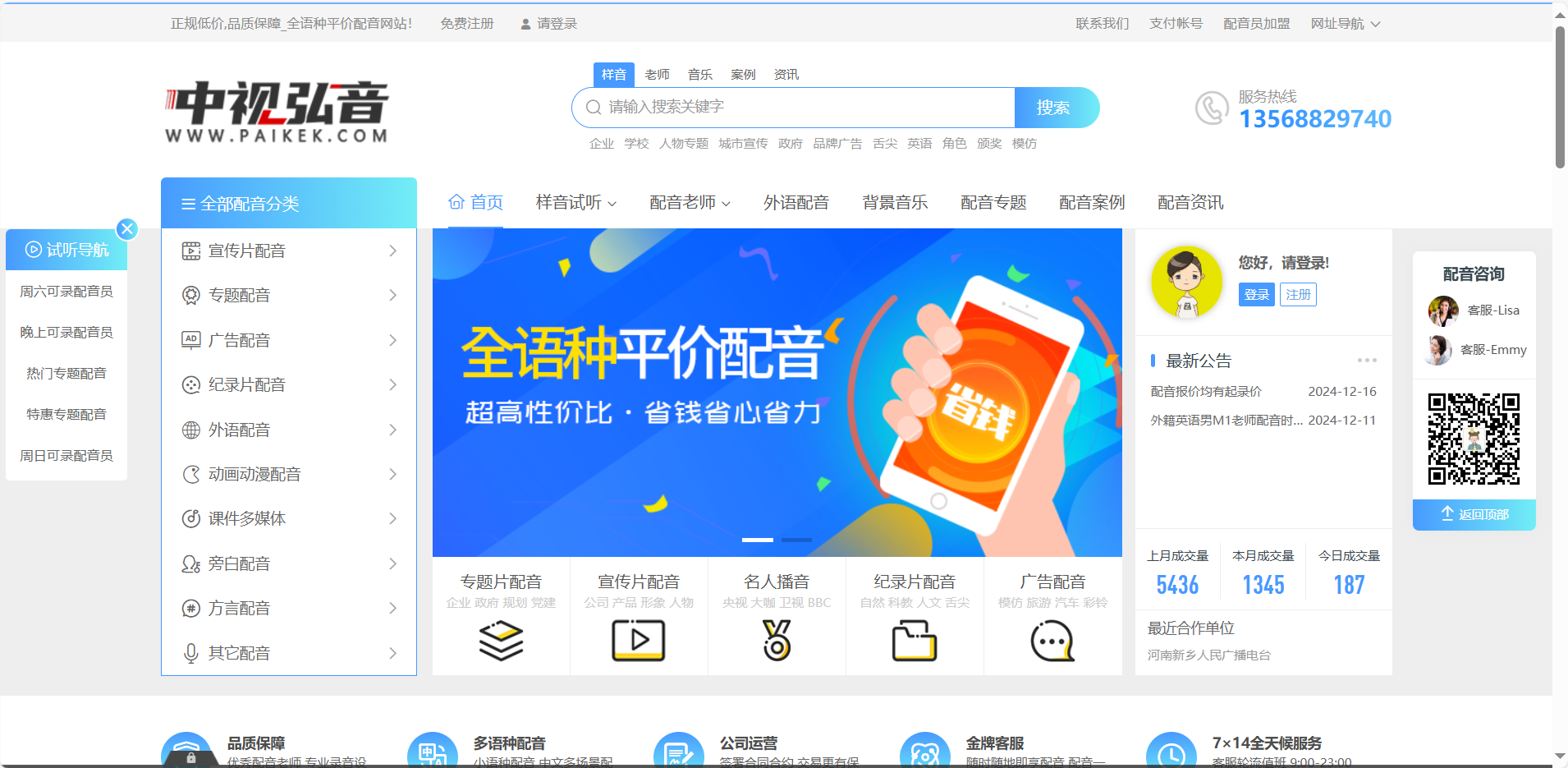 中视弘音是一个专注于提供全语种平价配音服务的网站,致力于为宣传广告、游戏动画、外语英语配音等多种场景提供高质量的配音解决方案。平台以“7×14全天候服务”为特色,客服团队轮流值班,确保用户在工作日的9:00-23:00都能获得及时的服务支持。中视弘音凭借其丰富的配音资源、专业的配音团队和高效的服务流程,成为企业和创作者在配音需求上的可靠选择。