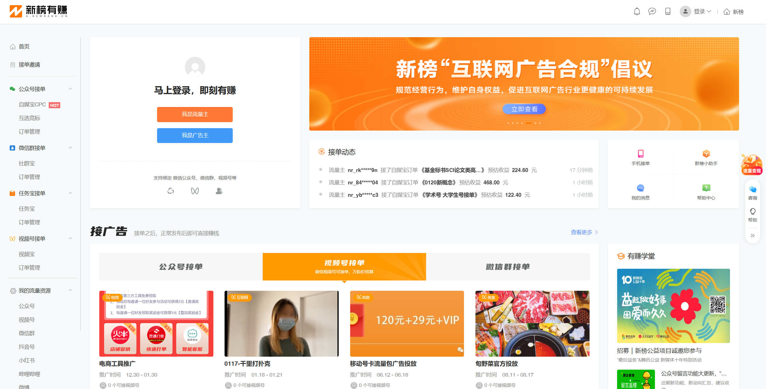 变现的平台,旨在帮助自媒体创作者和流量主通过接单和推广实现商业价值。平台提供丰富的变现渠道,包括广告推广、内容创作、商品推荐等,同时为品牌方和广告主提供精准的自媒体资源对接服务。通过新榜有赚,自媒体创作者可以轻松找到适合自己的变现项目,实现流量变现和收入增长。