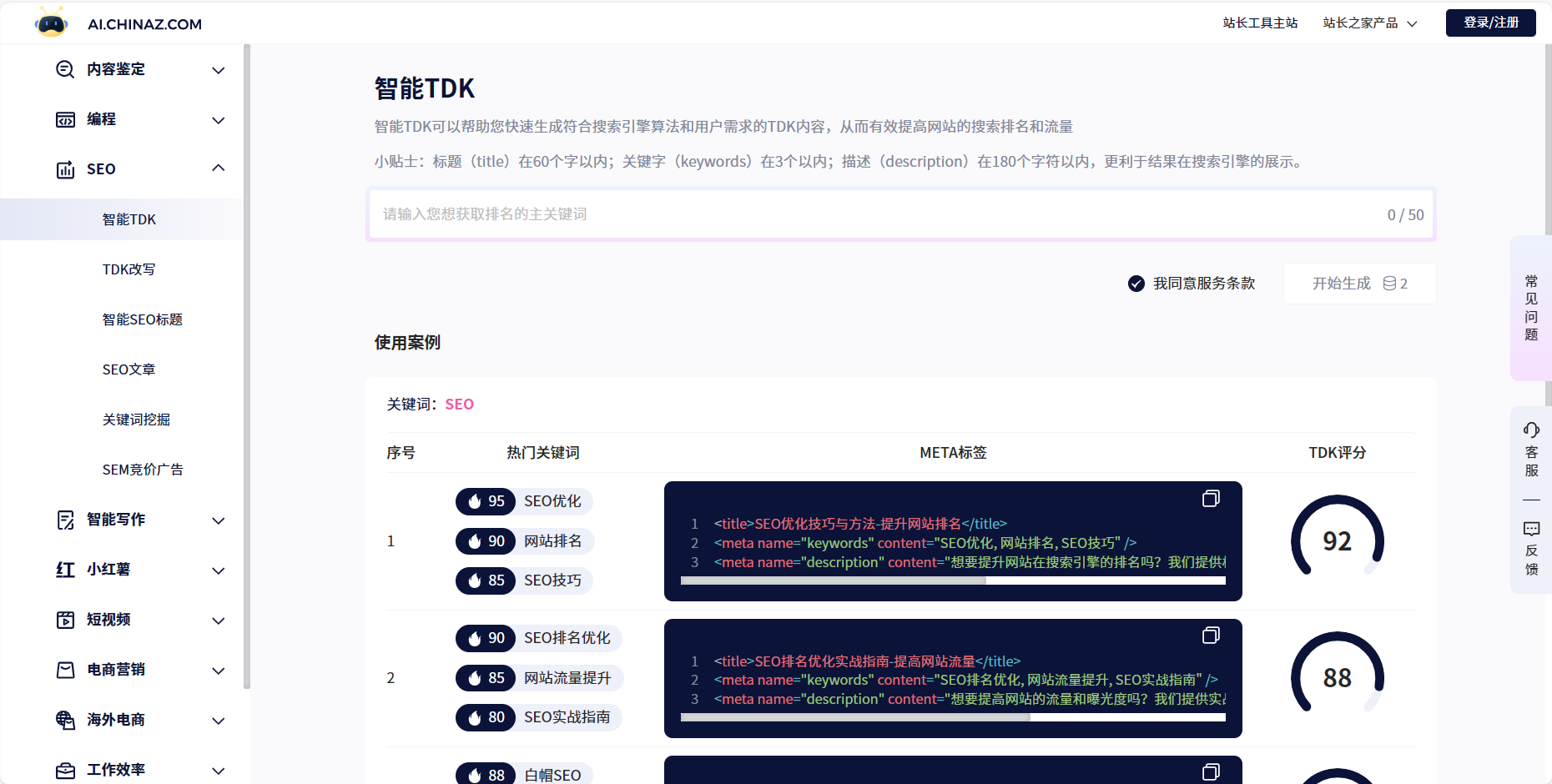 - 输入关键词:输入目标关键词,开始生成TDK。