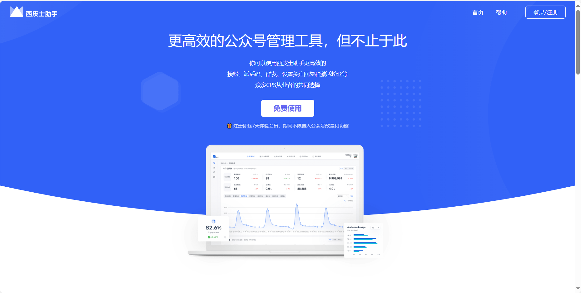 - 注册/登录:访问西皮士助手官网 https://mp.cpshelp.cn/ 并注册账户,登录后开始使用。