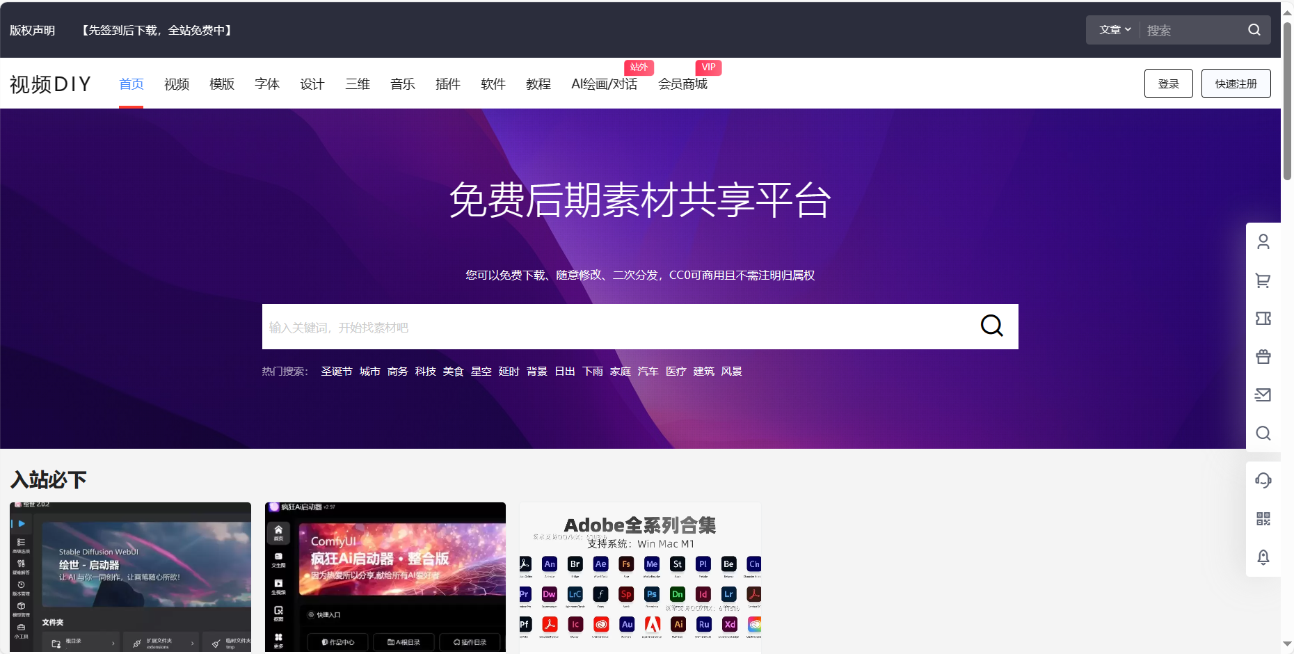视频DIY素材网是一个免版权视频素材、AE模板、设计素材、FCPX视频音乐音效的免费分享平台。该平台致力于为视频制作者、设计师和创意工作者提供免费的资源,以支持他们的创作和项目需求。