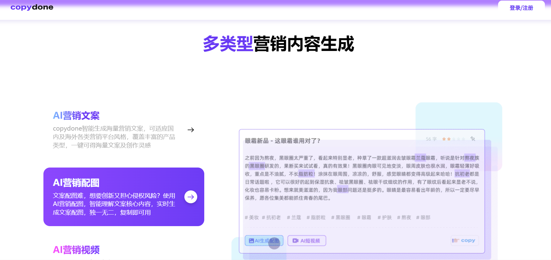 CopyDone是一个原创文案写作神器,也是一款写作机器人,它利用AI技术一键智能生成营销文案、配图和视频,满足不同营销平台和产品类型的需求。